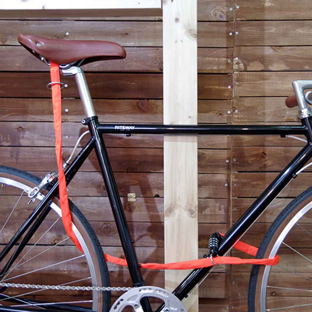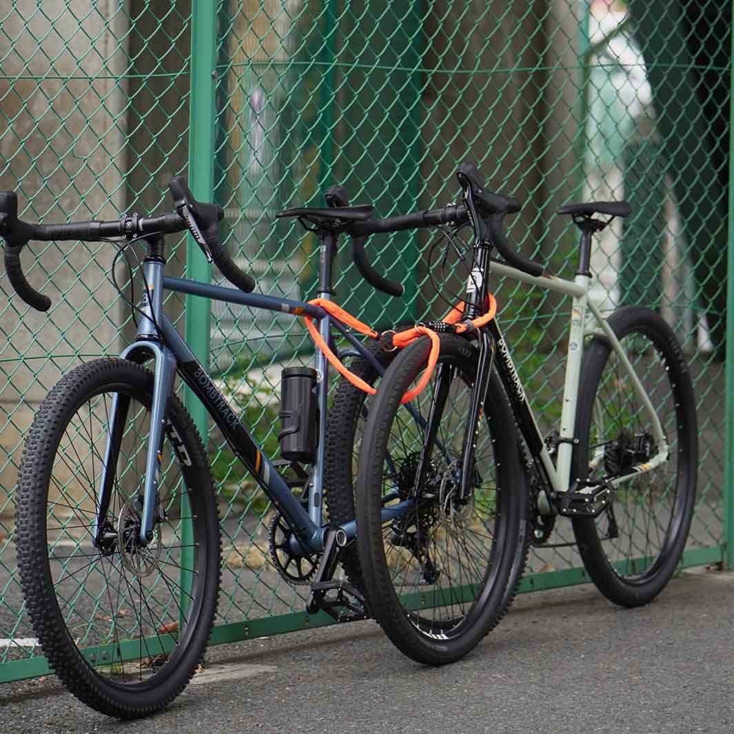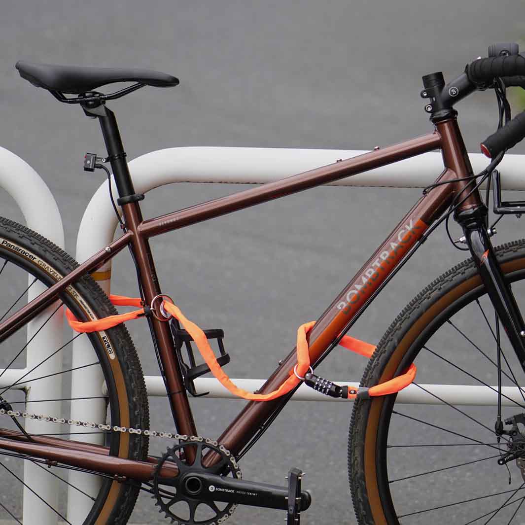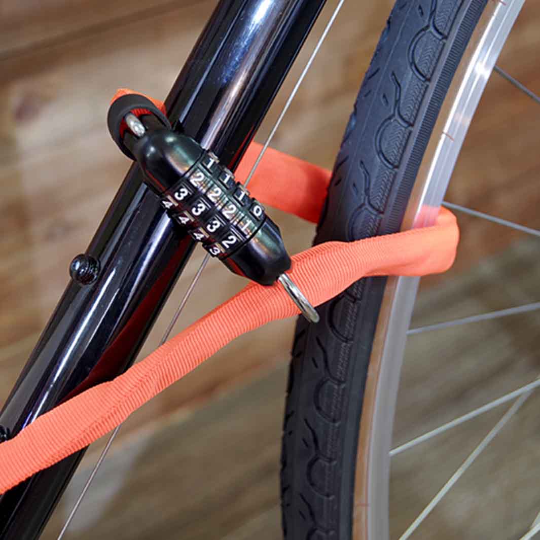 ダイヤル式のチェーンロック。ダブルループ構造をうまく使うことで前輪と後輪にそれぞれチェーンの輪をかけたり、2台一緒にロックをかけたり、いろいろな使い方ができます。140㎝という十分な長さで地球ロックもしやすいです。