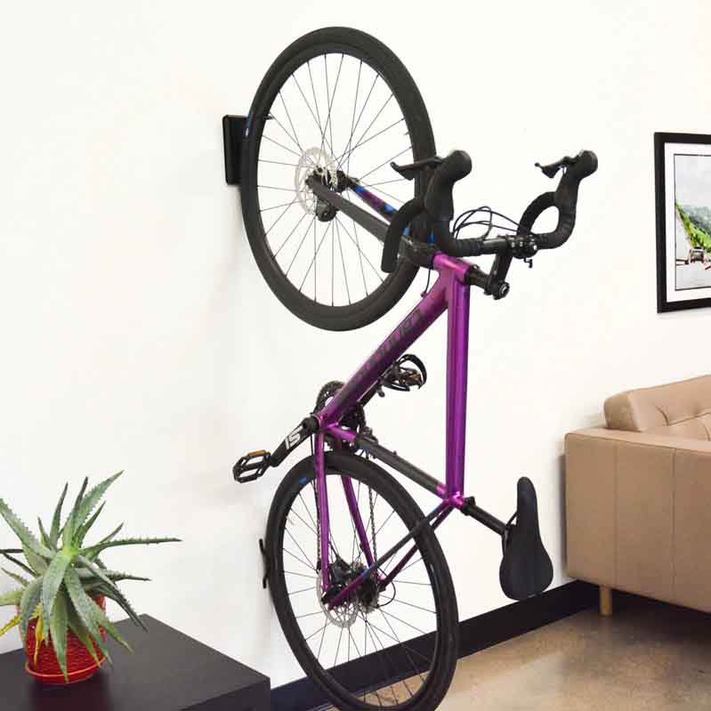 Velo Hingeは、壁面に木ネジを使って固定するタイプのバイクスタンドです。従来のフロントタイヤを引っ掛けて固定するタイプのバイクスタンドでは、掛けた後にバイクが壁に対し90度の角度となるため部屋の中で邪魔にされがちでした。VELO HINGE2.0はその名の通りヒンジ構造をフック部分に持たせたディスプレイスタンドで、壁に掛けたバイクを手で押せば、ドアをあけたときのように可動させることができます。使用しない時は畳んでおけるので邪魔になりません。
