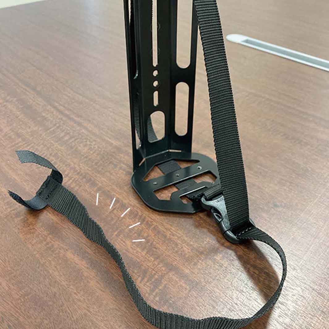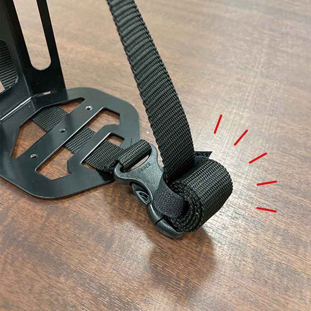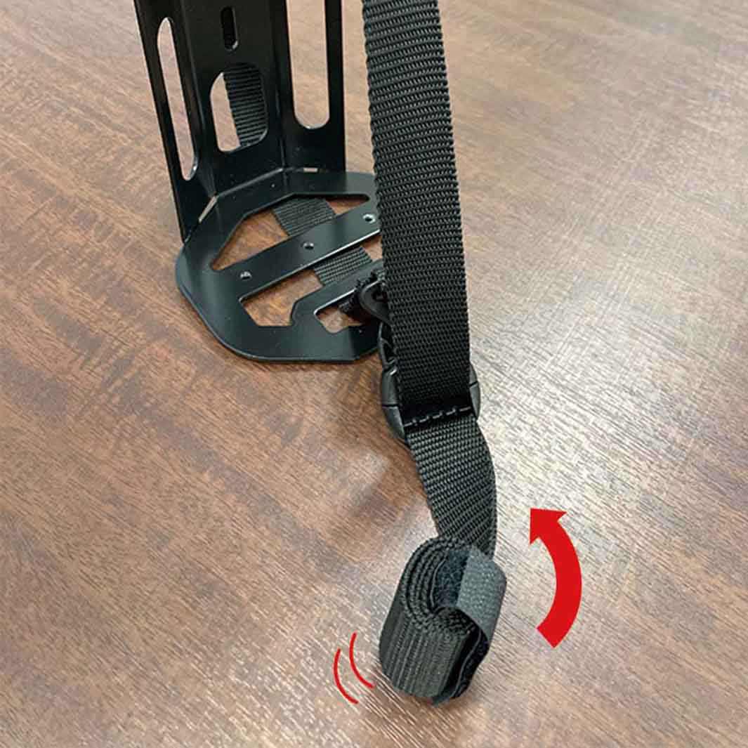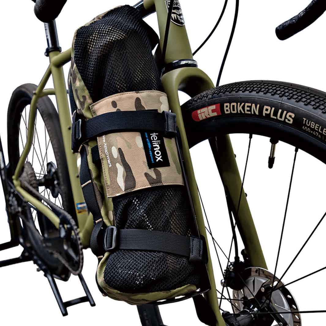 付属の横ベルトでベストな位置にしっかりと固定でき、オフロードライドでの荷物の縦揺れによるズレを解消できるよう、縦ベルトも付属。ケージの底部には25mmピッチのM4ネジ穴3個があり、マウントブラケットの取り付けが可能な為、ライトやアクションカメラの設置もできます。