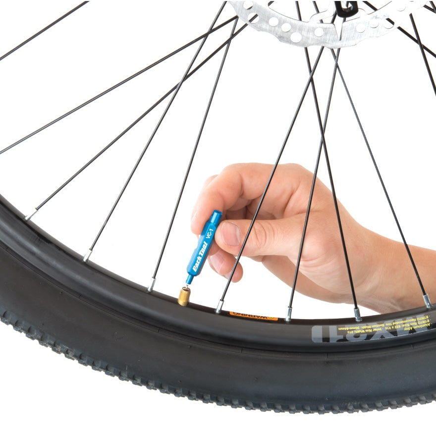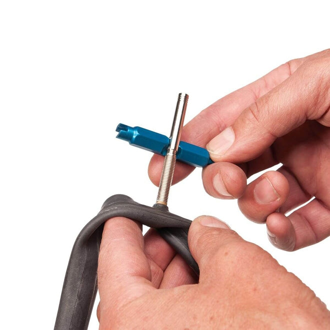 タイヤチューブのバルブ用レンチ。米式や仏式のバルブコアの脱着が可能。仏式のバルブエクステンダーを取り付ける際に便利な5㎜のレンチの機能もまとまっています。