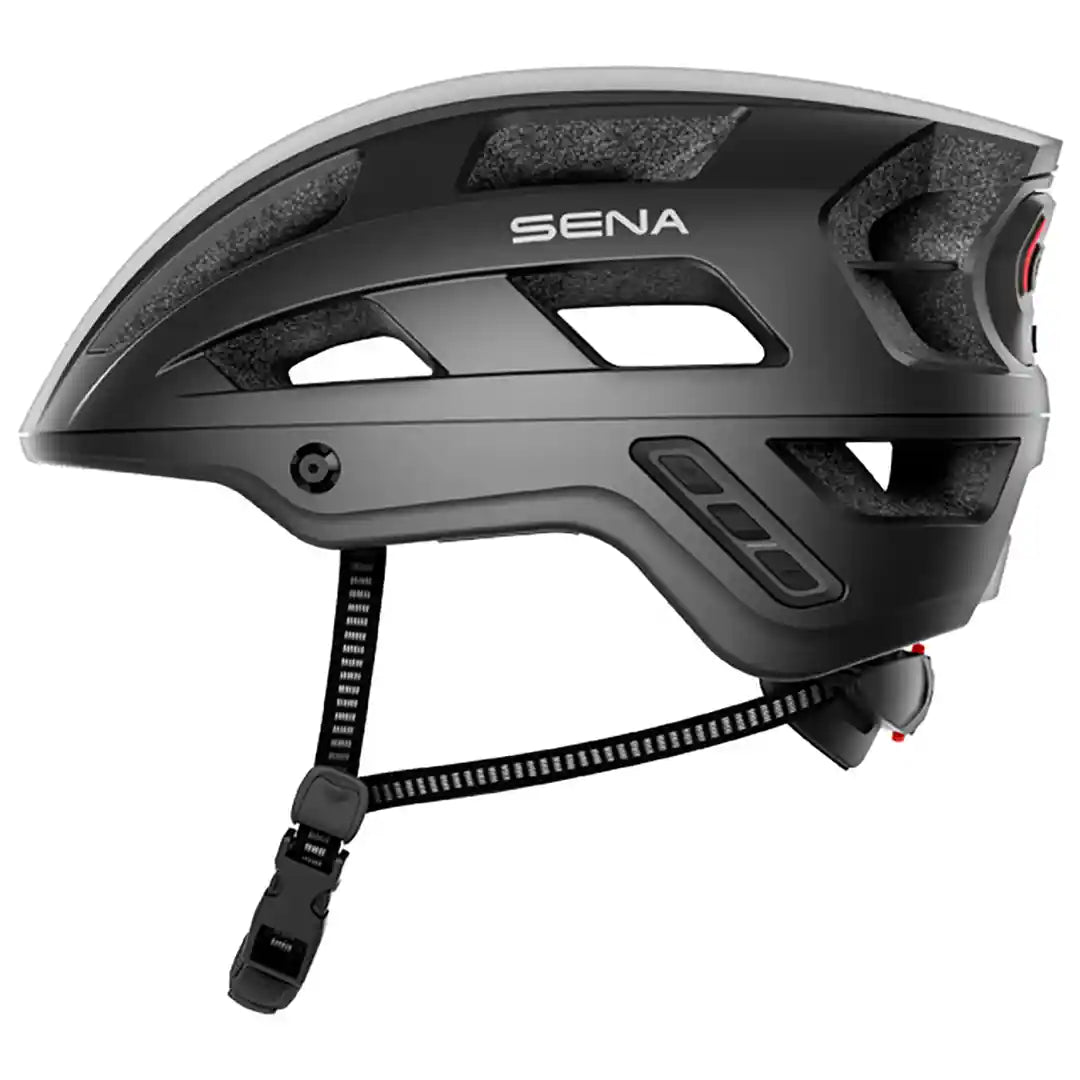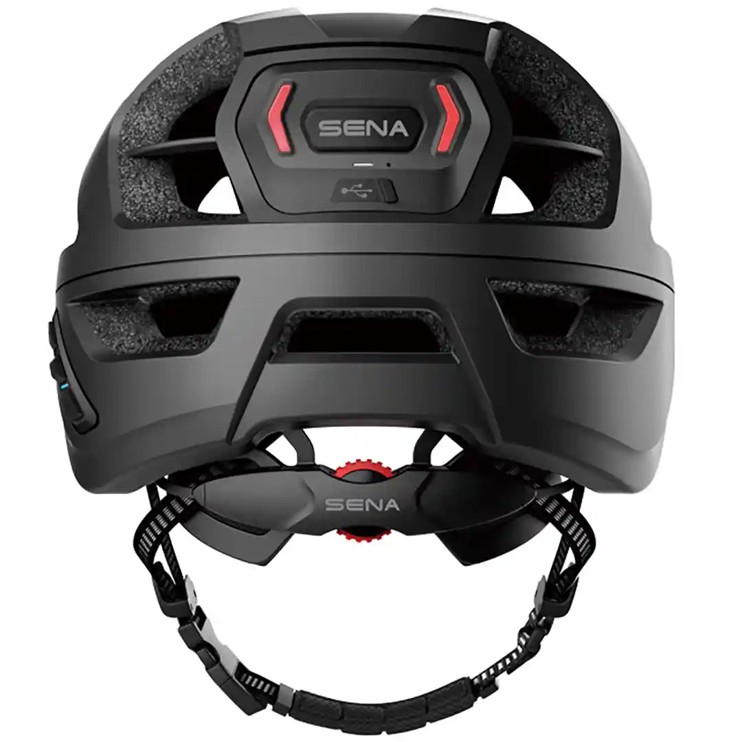 SENAのスマートヘルメットは耳を塞がない指向性スピーカーを採用。周りの環境音に気を配りつつも、仲間と話しをしたり、音楽を聴いたりする事ができます。内蔵マイクはSENA独自のノイズキャンセリング機能を搭載し、通話中のノイズや走行中の風切音を抑え、会話中の声をクリアに届けてくれます。またヘルメットの後部にはテールライトが内蔵されており、被視認性も高いヘルメットになっています。