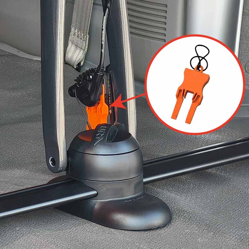 車載時に後輪を外しても安心。リアエンドに装着して、オイル汚れやディレーラー接触を防ぎます。標準で12×142mm対応、付属パーツで9mmQR(130/135mm)や12×148mmブーストにも対応します。