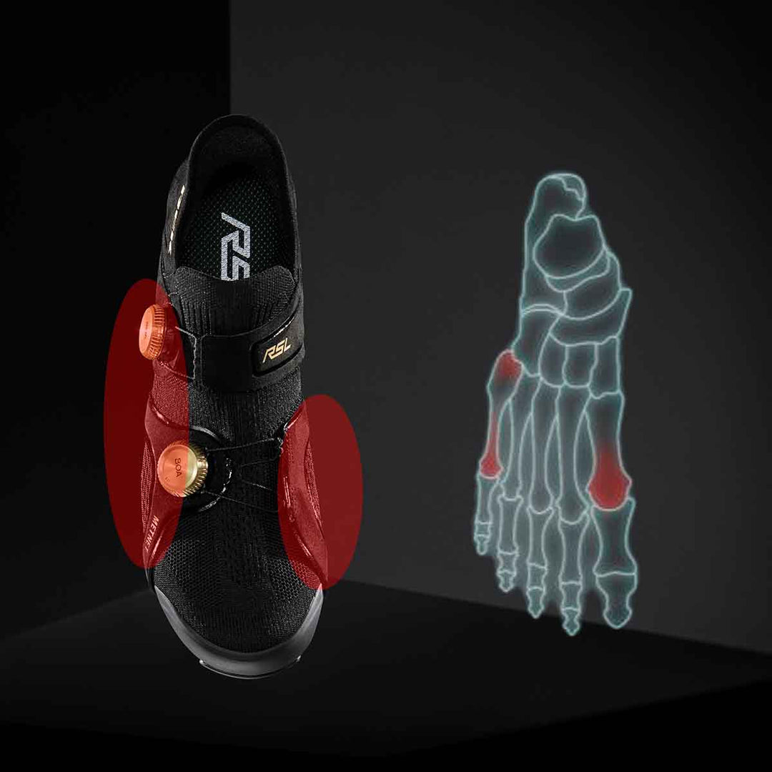 タイトなフィットのシューズはパワー伝達をしやすいものの痛みを引き起こしやすくなります。ペダリング中に、もっとも不快感や痛みを生じやすい場所は、主に母指球周辺と、外側の小指球からかかとに向かう第五中足骨周辺です。