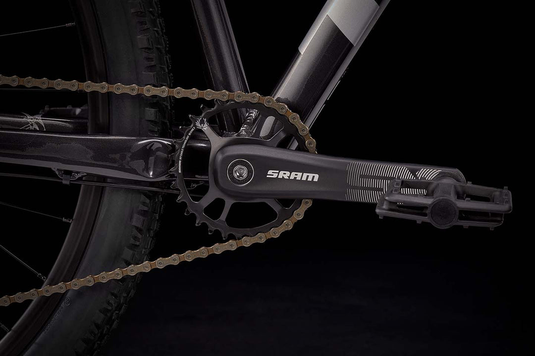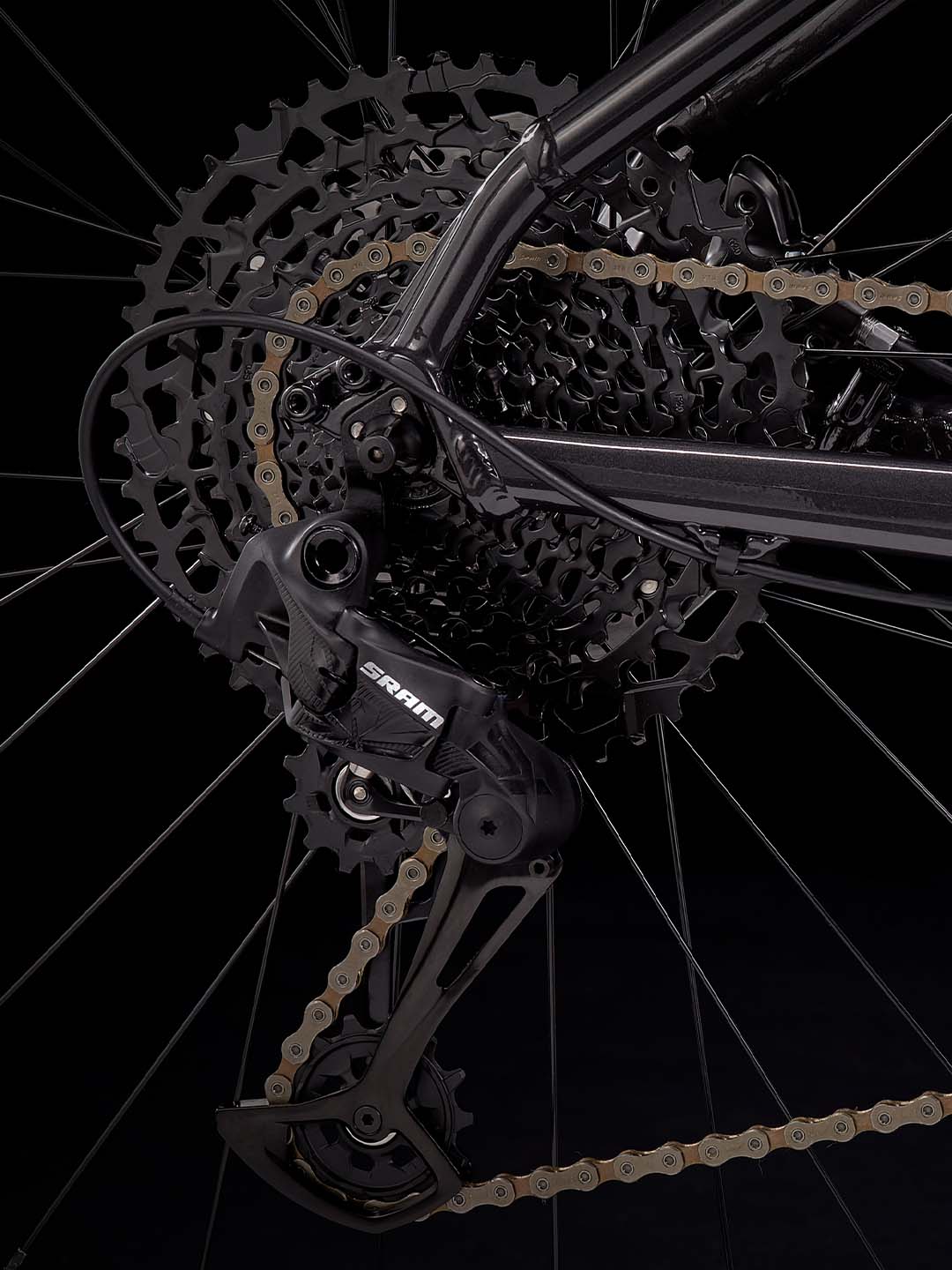 フロントシングルのドライブトレインは変速時のトラブルの軽減や無駄を省くことでより効率的にライドを楽しむことが可能です。リアのSRAM SX Eagle 12速でトレイルの急な登りも安心。