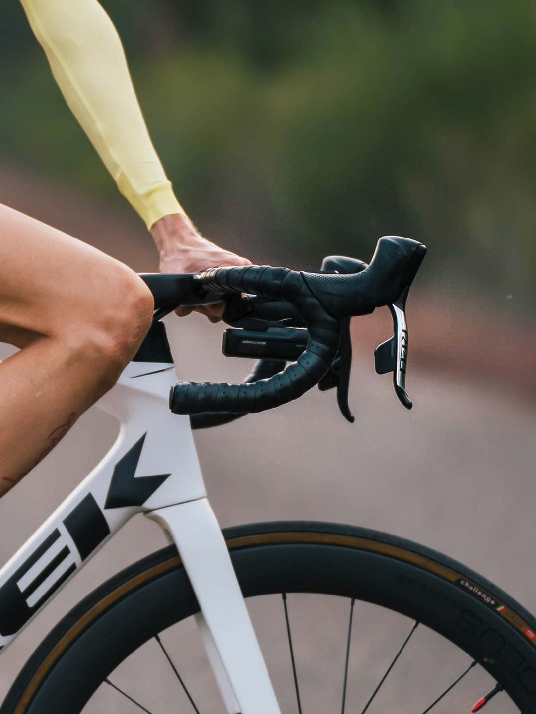 上体が最も前傾になる握り位置。風の抵抗を避けたい時や下りで重心を低くしたい時、下りなどブレーキをしっかりと掛けたい時、スプリント時など瞬間的に強く漕ぎたい時に重宝する。