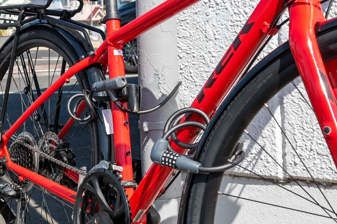 太くて長いケーブルロックを最低1つ使って、車体をどこか括り付けられる場所に括り付けるのが最低限の盗難対策です(通称:地球ロック)。さらに盗難を予防するのであれば、前輪、フレーム、後輪、全てが盗まれないように複数鍵をかけましょう。