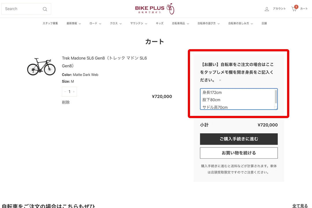 このメモ欄に、実際に自転車に乗られるご本人さまの身長・股下をご記入ください。今乗られているスポーツ自転車のサドルの高さがわかる場合はそちらもあわせてご記入ください。