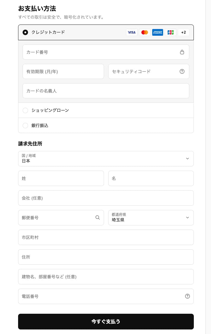 クレジットカード情報をご入力いただき、カード会社にご登録済みの請求先住所と電話番号をご入力ください。請求先住所を変更することもできます。入力内容をご確認の上、『今すぐ支払う』を押してください。