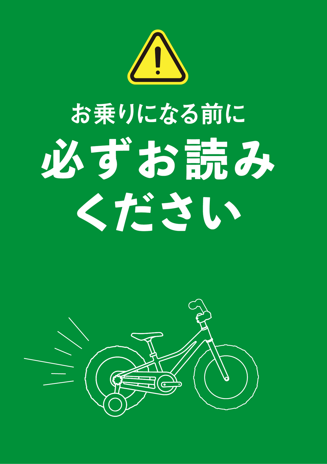 バイクには『必ずお読みください』という書類が同梱されています。そちらからスタートガイドにアクセスし、サドルの高さのセッティング方法や使い方ガイドなどをご確認ください。