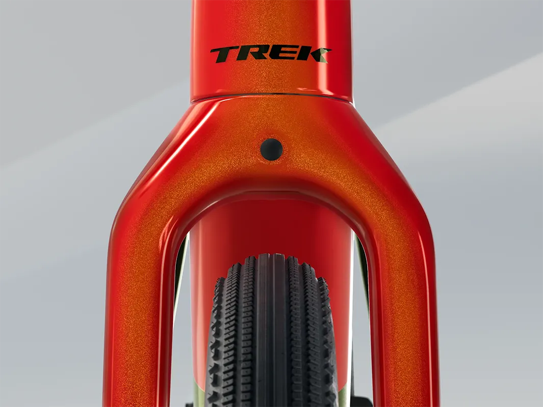500シリーズOCLVカーボンフレーム、カーボンフォーク、内蔵ダウンチューブストレージ、フレームとフォークにマウント、50mmタイヤ(実測)用クリアランス。12速の1x SRAM Apex XPLR AXS フルワイヤレスドライブトレイン、油圧ディスクブレーキ、カーボンシートポスト、42mmタイヤ装備のチューブレスレディBontrager Paradigm SLホイール。